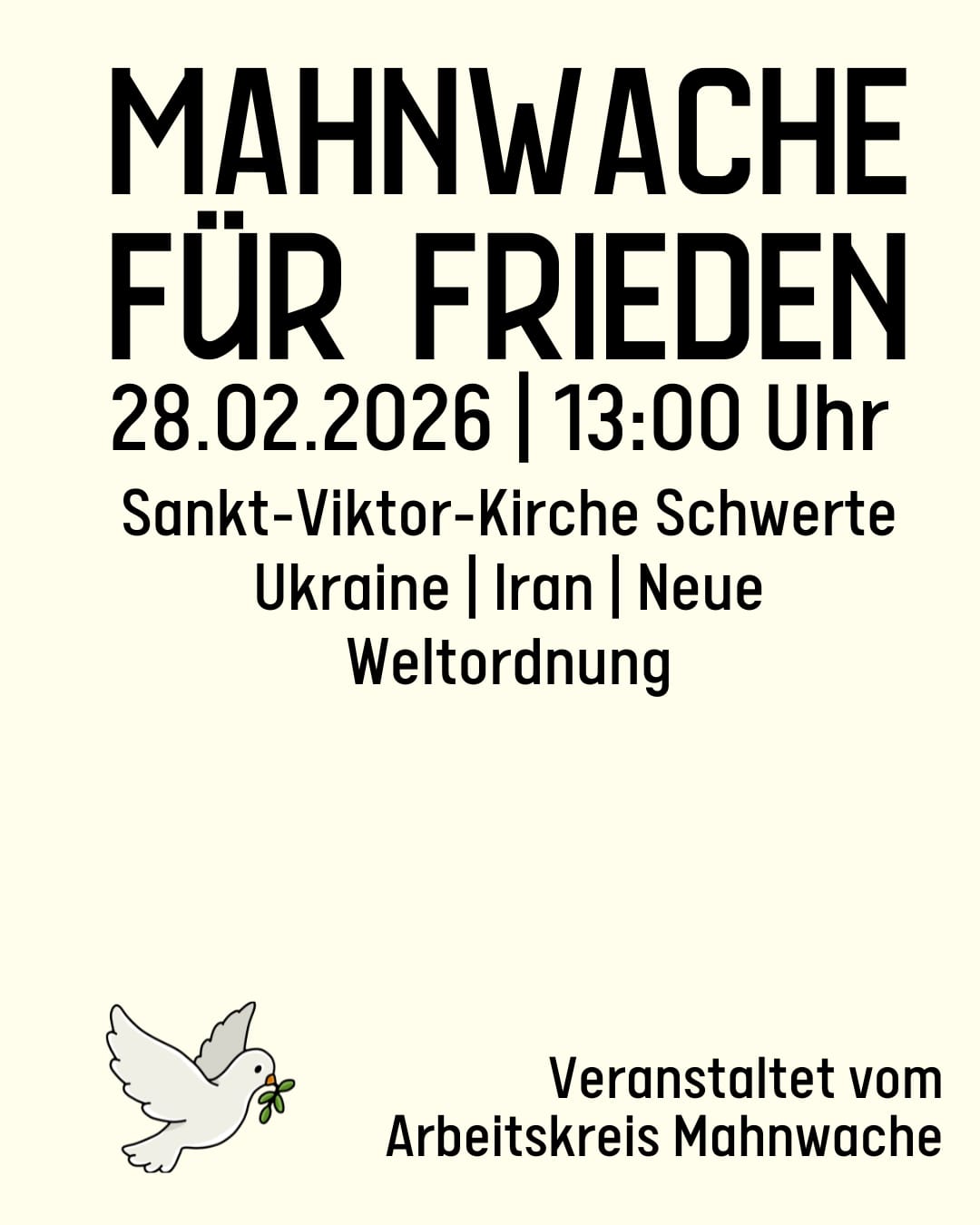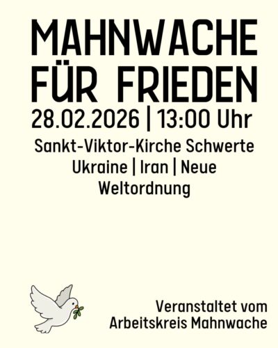 Der „Aktionskreis Mahnwache“ lädt erneut zur einer Mahnwache in Gedenken an Krieg, Flucht und Vertreibung am 28.2.2026 um 13 Uhr in die St. Viktor Kirche Schwerte ein.